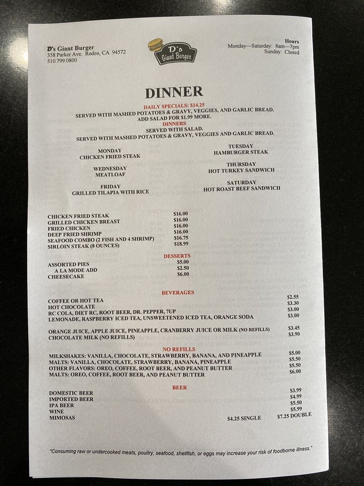 D’s Giant Burgers is a cozy American diner located in Rodeo, CA, known for its delicious burgers and shakes. The menu offers a variety of mouthwatering options, including 1/3 lb. burgers, chili plates, fish, and chicken dishes. Customers rave about the quality of the food, with reviews praising the burgers, shakes, and friendly service. The diner has a nostalgic ambiance, perfect for a family meal or casual hangout with friends. While prices may be slightly higher than average, the tasty burgers and welcoming atmosphere make it worth the visit. Don't miss out on their set dinner specials and breakfast burgers for a satisfying meal any time of day. Overall, D’s Giant Burgers is a must-try for those craving classic American comfort food in a laid-back setting.
